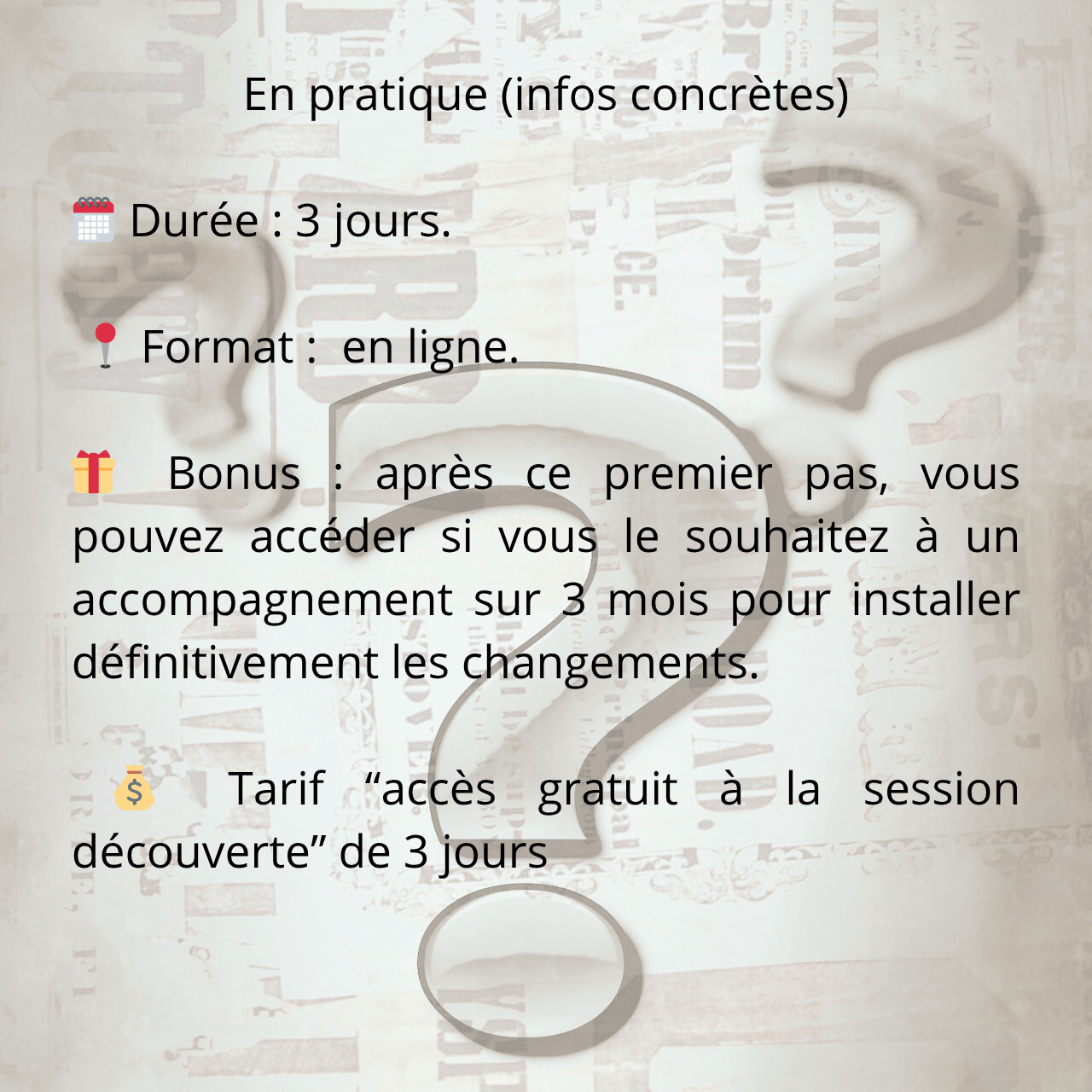 Pendant 3 jours de transformation, je vous guide pas à pas à l'aide d'un support vidéo et d'exercices pratiques.